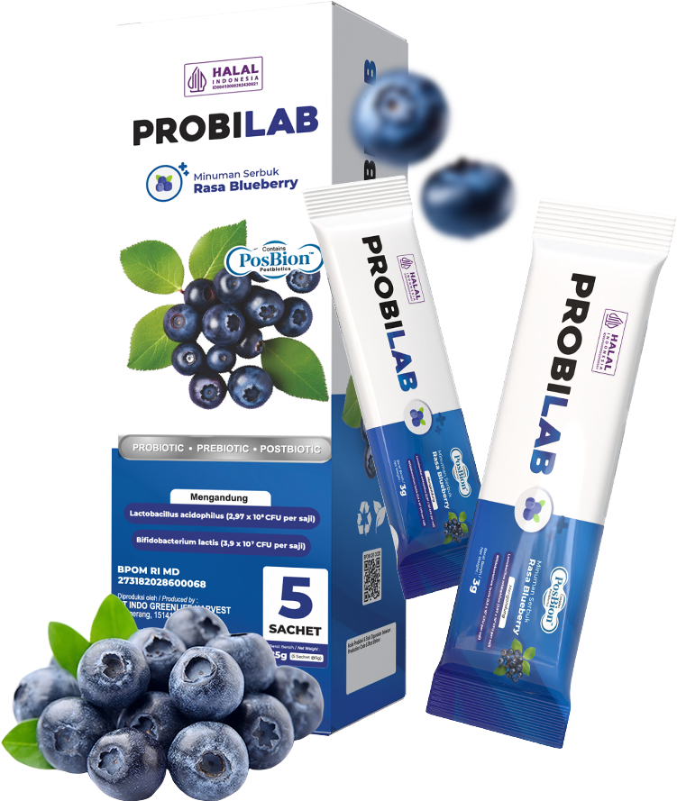 PROBILAB Blueberry adalah minuman postbiotik yang mengandung probiotik, prebiotik, dan postbiotik untuk mendukung kesehatan pencernaan, mengatasi GERD, alergi, dan meningkatkan daya tahan tubuh. Sudah BPOM dan Halal MUI.