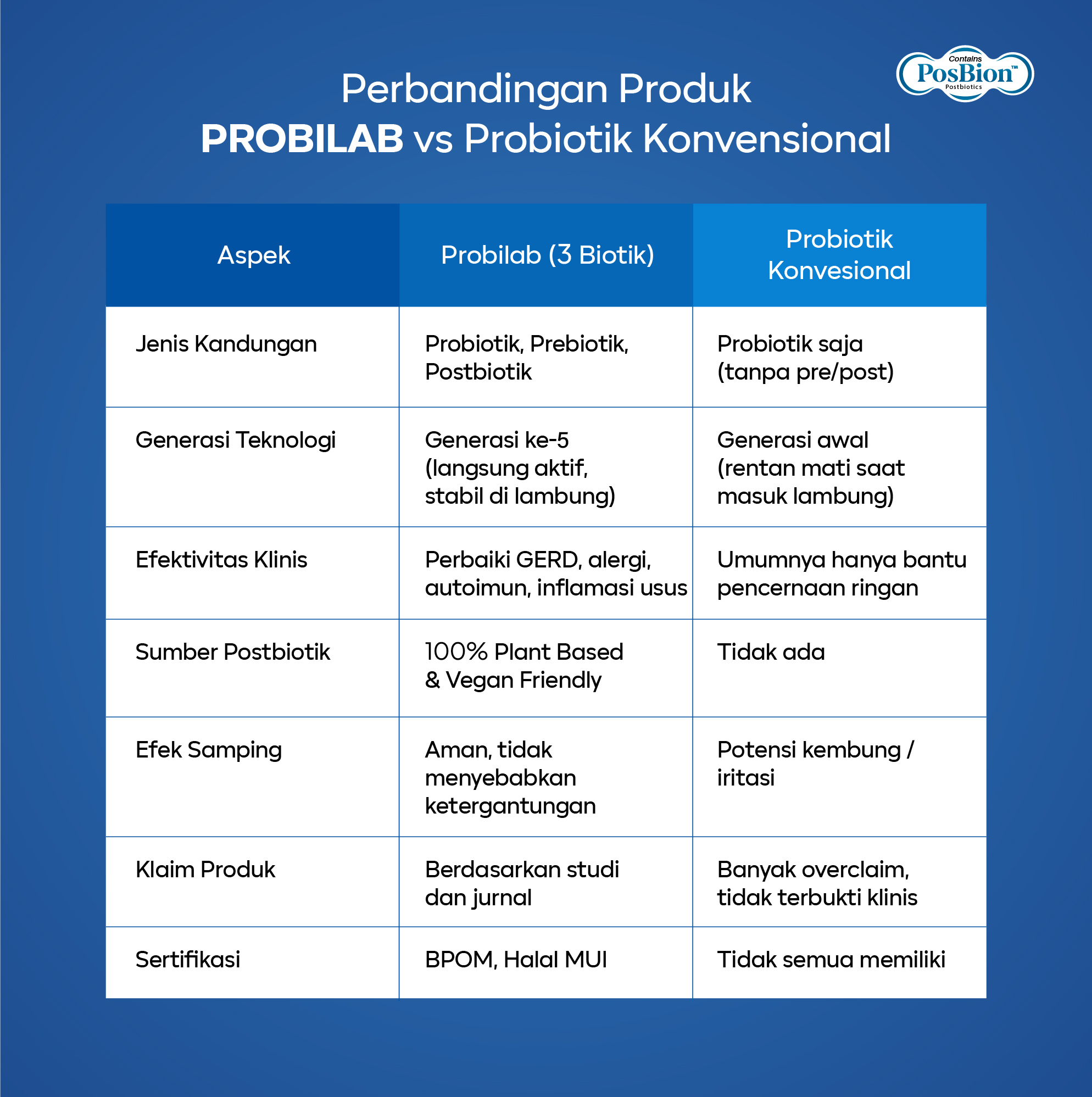 PROBILAB Blueberry mengandung 3 Biotik (probiotik, prebiotik, dan postbiotik) yang bekerja secara sinergis untuk memberikan manfaat lebih. Probiotik dalam PROBILAB (Bifidobacterium dan Lactobacillus) membantu menyeimbangkan mikroflora usus, prebiotik (Inulin) mendukung pertumbuhan bakteri baik, dan postbiotik membantu mengurangi inflamasi serta memperbaiki pencernaan. Produk ini lebih stabil dan efektif karena kandungan postbiotik yang tidak mudah rusak di lambung. Berbeda dengan produk probiotik konvensional yang hanya mengandung probiotik tanpa dukungan prebiotik dan postbiotik, serta rentan mati saat masuk lambung.